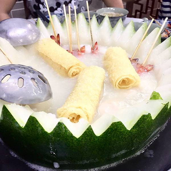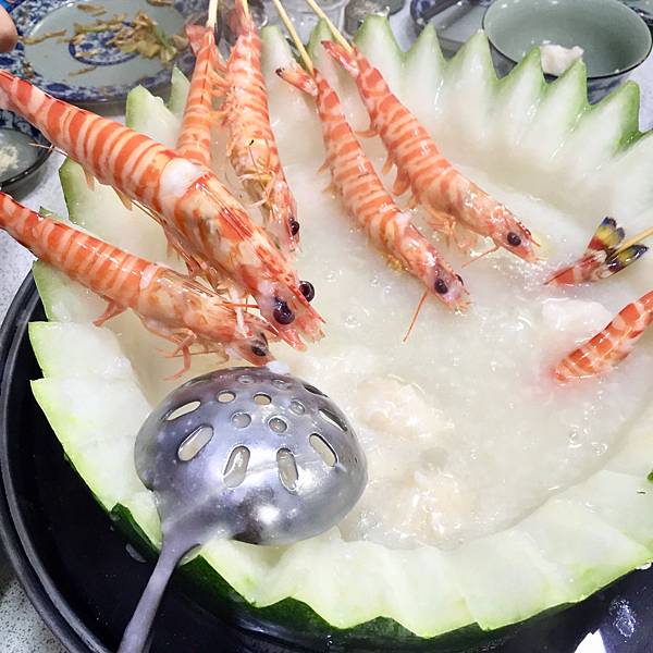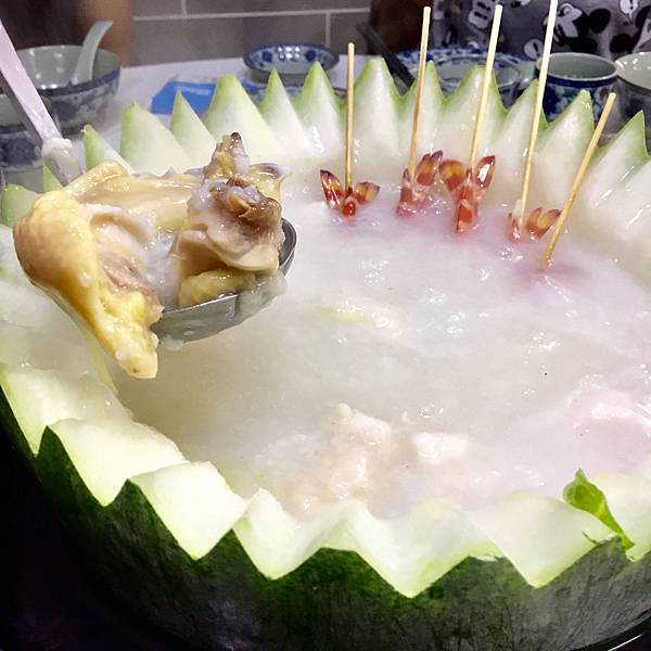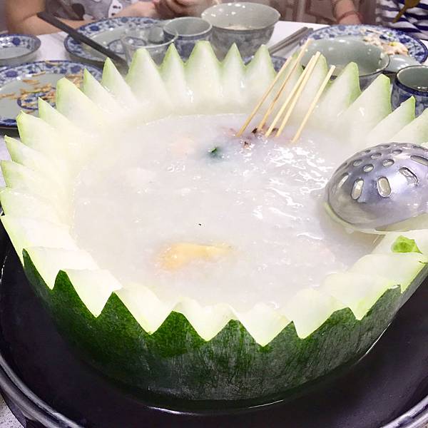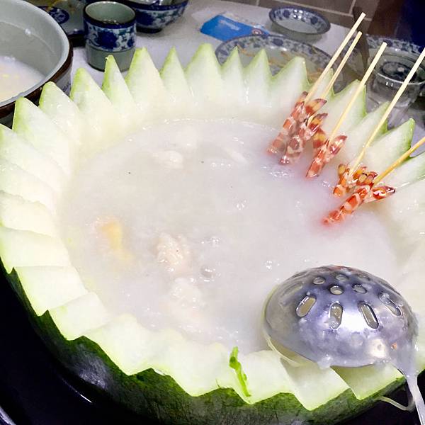 白粥粥底,用整個冬瓜盅包覆,冬瓜的青甜味滲入粥內!粥底火鍋,很特別的吃法。