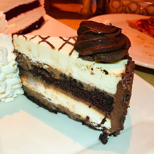 這款是沒有芝士的蛋糕,全部以朱古力海綿蛋糕、朱古力醬和朱古力鮮奶油結合而成的,因為外層的朱古力醬偏苦,所以味道不甜,很好吃!如果你跟桃桃一樣喜歡朱古力的朋友,一定要嚐嚐這個。這款的size比較大一些,切片比上亮片芝士蛋糕薄,但是蛋糕本身厚度(高度)較厚,所以建議兩個人吃、或者一群人一起吃比較好喔!