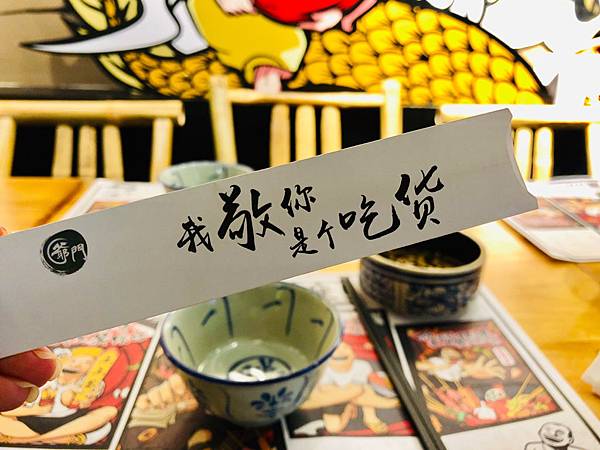 桌上的餐桌紙,讓人看了會心一笑,搭配的餐具,應該是經過一番挑選,給人一種:「爺請大口吃肉,大口喝酒吧!」