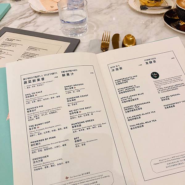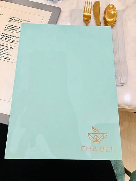 菜單封面用的是Tiffany藍的粉淡藍綠色,餐具都用金色,在柔和中增添一絲貴氣!