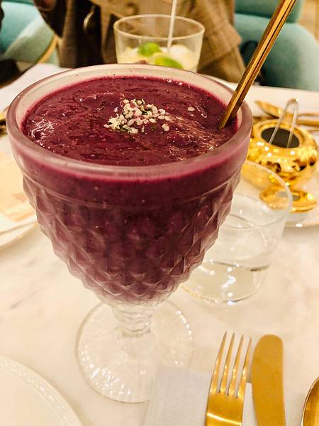 桃桃喜歡莓果類水果,看到菜單上寫裡面有希臘酸奶,但是喝起來酸奶的味道不重,可能被杏仁奶的味道稀釋了吧!但是桃桃也喝不出杏仁奶的味道,飲料偏像冰沙,因此附了小湯匙讓妳挖取。