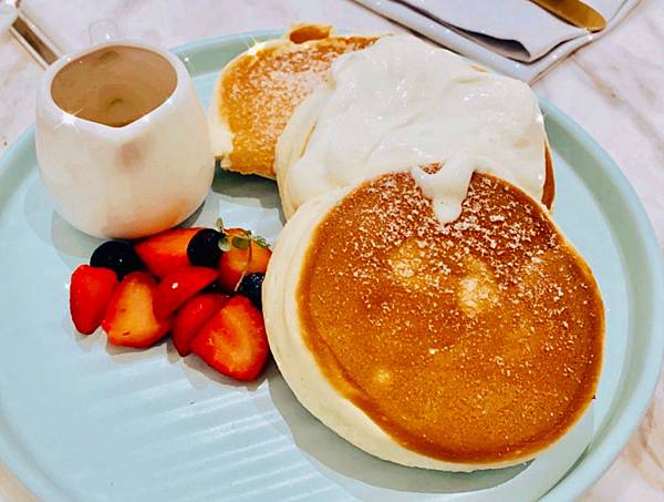 因為沒有什麼甜點可以選擇,因此選擇了蘇芙蕾鬆餅,水果是以莓果類為主(草莓和藍莓),搭配鮮奶油和蜂蜜,但是桃桃覺得蘇芙蕾鬆餅不夠鬆軟,比較像是厚一點的美式鬆餅。