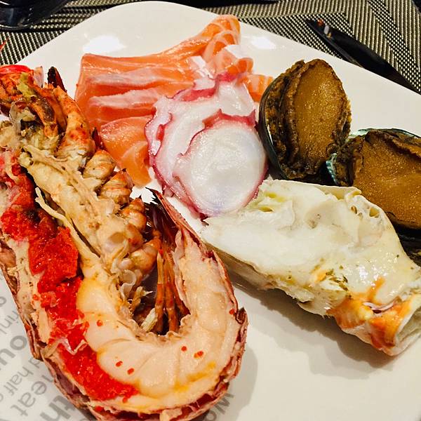 海鮮類應有盡有:有龍蝦、生蠔、長腳蟹、鮑魚、螃蟹和刺身,刺身有三文魚(鮭魚)、吞拿魚(鮪魚)、希靈魚、甜蝦和章魚腳。