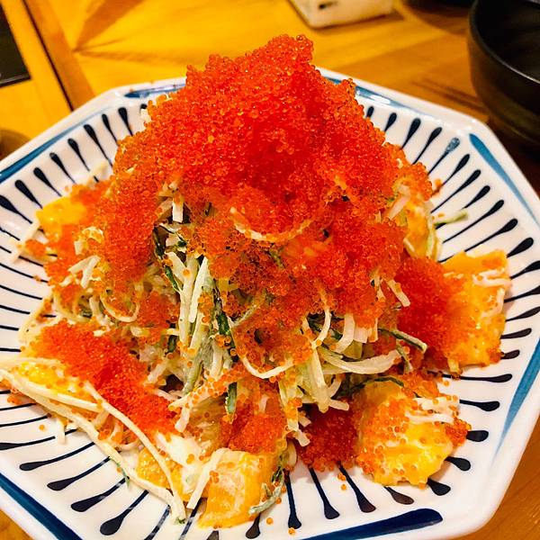 看到這滿滿的蟹籽,就知道店家的誠意。將蟹籽和沙拉拌勻,每一口都吃到蟹籽,當蟹籽爆開的一刻,蟹籽的味道在口中發散,沙拉的清甜配上蟹籽多層次的口感,這是鮮甜的美味。