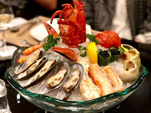 海鮮拼盤有龍蝦、生蠔、魚子醬、長腳蟹、海螺、淡菜(青口/孔雀蛤)。