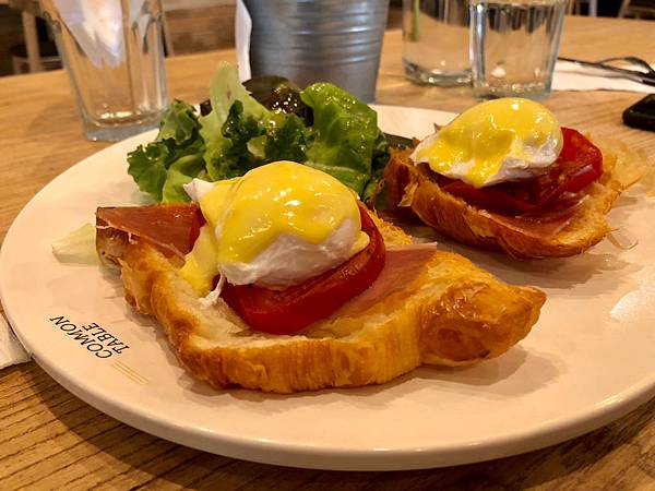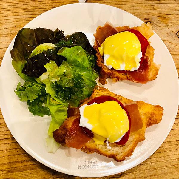 有烤過的牛角包為基底,酥脆多層次的外皮,一口咬下,滿嘴都是卡滋卡滋的聲音,班尼迪克半熟蛋搭配荷蘭蛋黃醬,美味可口,蛋黃流出的那一刻,配上帕爾馬火腿的鹹味,多層次的口感創造味蕾的饗宴。