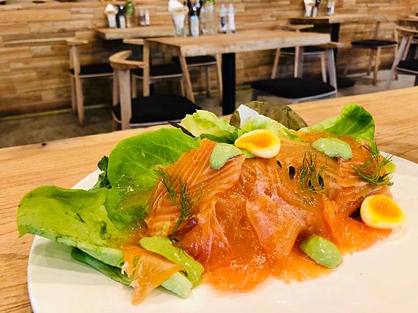 用牛油果(酪梨)中和煙燻三文魚(鮭魚)的鹹味,搭配鵪鶉蛋和沙拉,清爽可口。