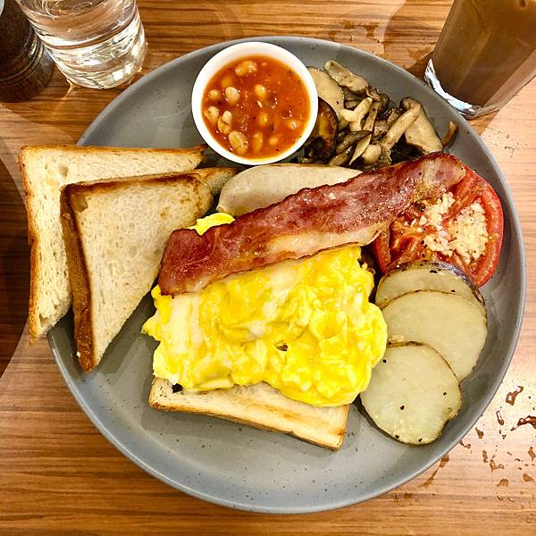 英式早餐裡面有自選蛋(水波蛋、煎蛋、炒蛋)、煙肉(培根)、香腸(豬肉香腸)、馬鈴薯、炒蘑菇、焗豆、烤蕃茄和烤麵包。