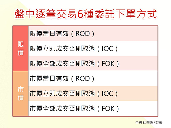 逐筆交易新制上路後,依照上述排列組合,共有六種委託方式供投資人選擇使用: