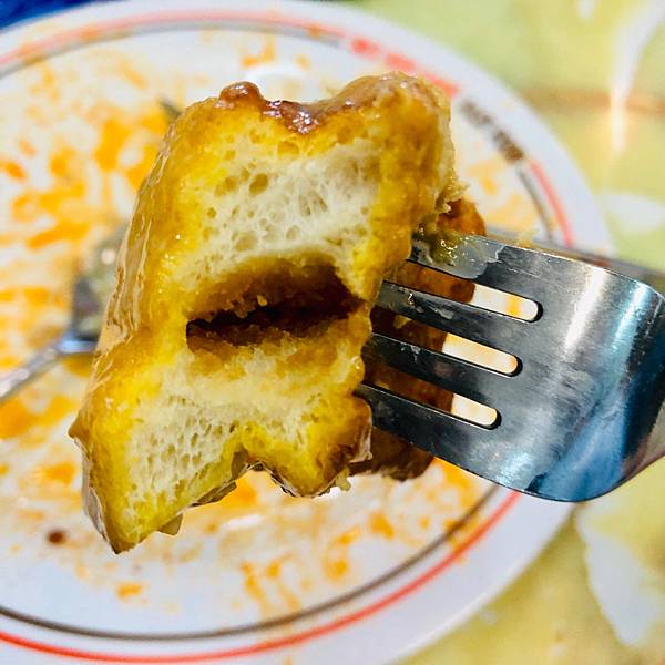 這是一口咬下的橫切面,可以看到多士的外皮有一層蛋液包圍,是西多士的感覺,但是桃桃個人比較偏愛外賣店的奶油方塊多士。