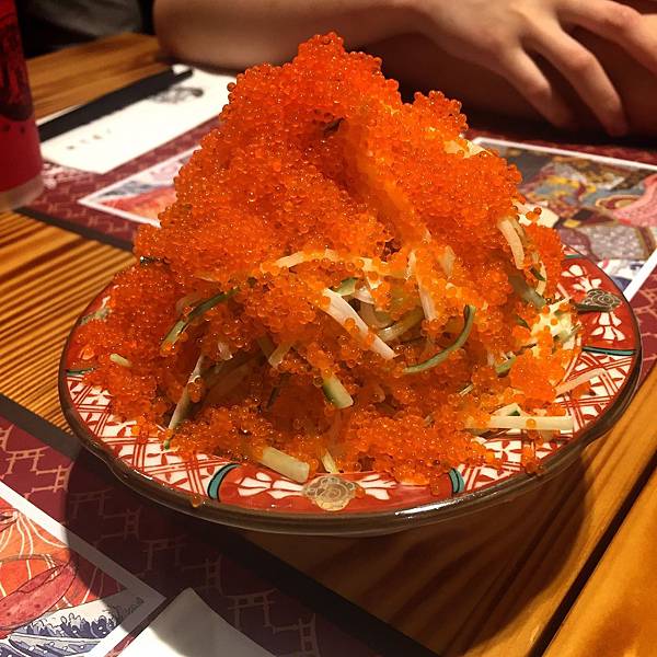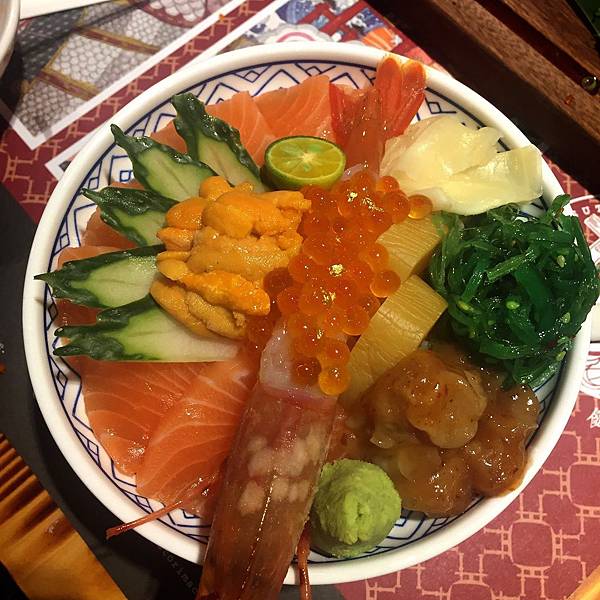 有三種生魚片:鮭魚(三文魚)、鮪魚(吞拿魚)、希靈魚,很可惜希靈魚可能尚未退冰,吃起來很硬,還有碎冰,除此之外:有鮑魚、甜蝦、蟹柳、蝦卵,算是海鮮應有盡有,CP值高的丼飯。