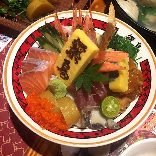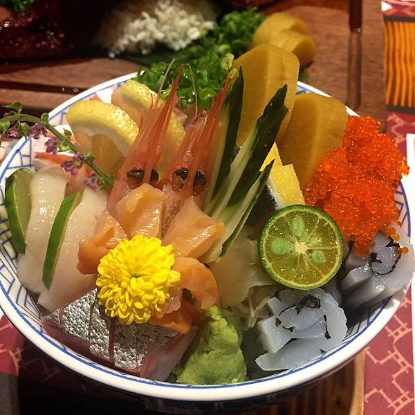 其實我不太清楚大蝦的品種,猜測應該是牡丹蝦,這隻大蝦真的很誘人!海膽味道也OK,鮭魚生魚片切的比一般丼飯的薄,但擺盤很美,配菜可以任選,整體水準中上。