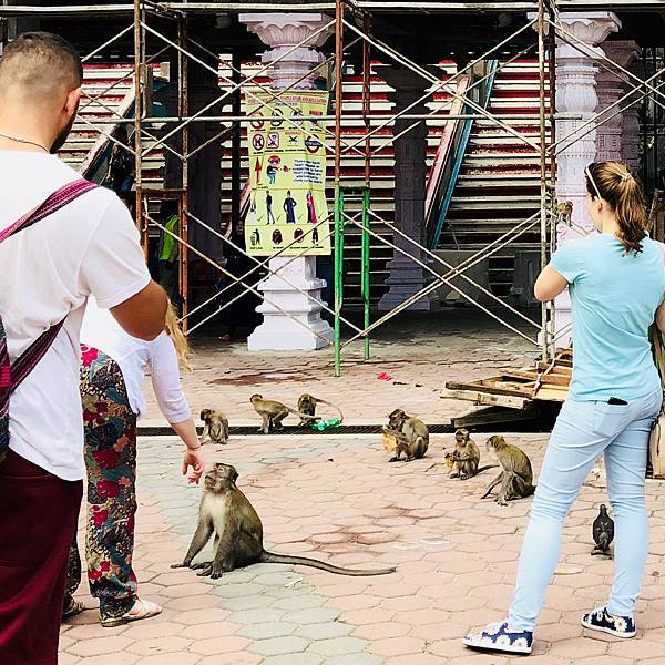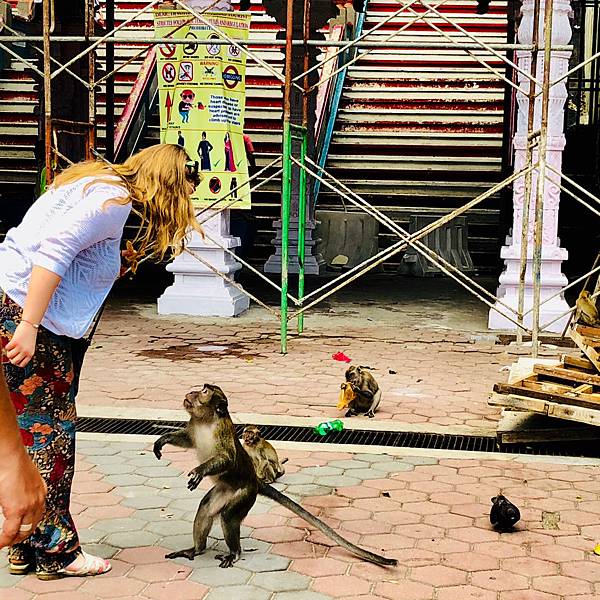 也有人帶了一串香蕉餵養猴子,不過大家來這裡還是要小心,我們蹲在地上拍照時,就有猴子默默接近搶我們的袋子(其實裡面只是一把折疊傘罷了)。