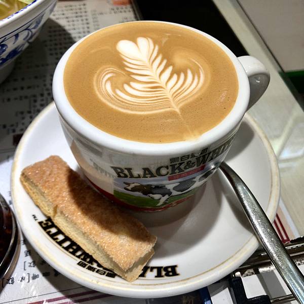 這個咖啡嚇到桃桃了... 這是一杯熱拿鐵,但請問你有在澳門茶餐廳喝過這樣拉花拉得這麼美的咖啡嗎?因為澳門多數茶餐廳的咖啡感覺是一般即溶咖啡隨便沖泡,再加奶(牛奶或三花奶)。