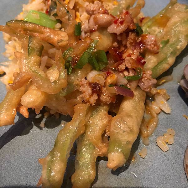 這道菜也是桃桃來澳門,澳門的朋友去泰式餐廳必點的菜色之一。澳門的通菜就是台灣的空心菜,醬汁方面每一間泰式料理的秘方都不同,但是這間的醬汁是白色的,不確定是不是椰奶,醬汁裡混著些打拋豬的肉碎。