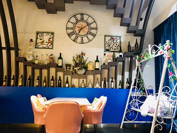 店內的整體風格很鮮豔繽紛,以寶藍色為底色,可能想呈現一個希臘度假風吧!搭配一些童話風的配飾與裝潢,還有一個童話花園的白色搖搖吊椅,單看覺得不錯,但是這麼多的元素和顏色(寶藍色牆壁、橘色椅子、白色吊椅、黑色裝飾)會讓人覺得眼花撩亂。