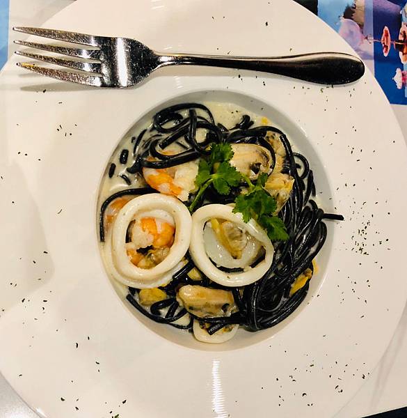 這款海鮮墨魚麵和桃桃想像的有些不同,桃桃以為醬汁會是墨魚汁,原來是以奶油醬汁為底;味道還可以,但是收汁收的不夠,所以義大利麵並沒有入味,感覺醬汁和麵是分開的。