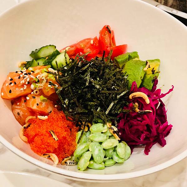 三文魚就是台灣的鮭魚。這道菜清爽可口,比較像是沙拉,但是主食是糙米;攪拌均勻就可以吃囉!
