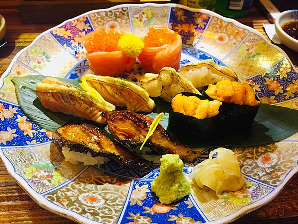 由左而右,上而下分別為:花之戀壽司、明太子炙燒三文魚壽司、明太子炙燒帶子壽司、鰻魚壽司、海膽壽司。