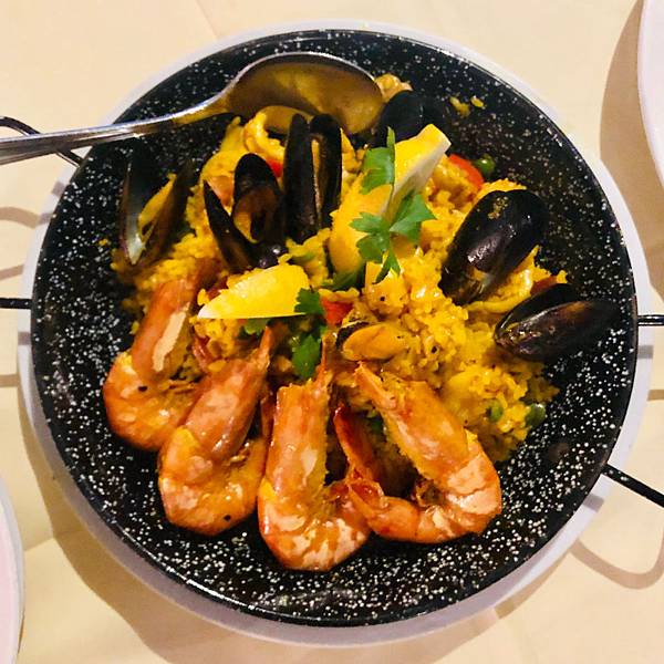 這款西班牙海鮮燉飯,用料十足,上桌的一刻,四隻大蝦和四隻青口(孔雀蛤或淡菜),和鮮魚片及魷魚,再用一點檸檬提味,讓海鮮散發更新鮮的食材原味;燉飯的味道也剛好,不會過軟或過硬,醬汁收斂的恰到好處,每一口都有濃濃的香氣。