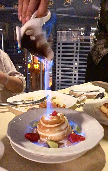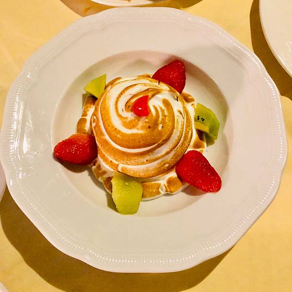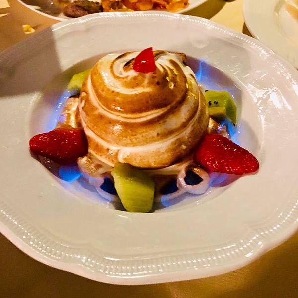 桃桃其實忘了名稱是不是這個...,乍看之下是一道很普通的甜點,看起來像是鮮奶油或蛋白霜覆蓋外層,再用火烤炙熱,接著裝飾上水果,大功告成。錯了...,其實內有玄機...。