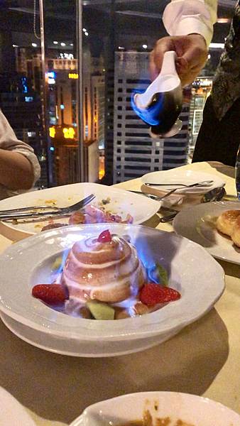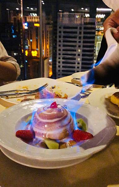 侍應(服務生)會倒上一種甜酒(忘記是不是香橙酒...),然後會發出一陣藍光。