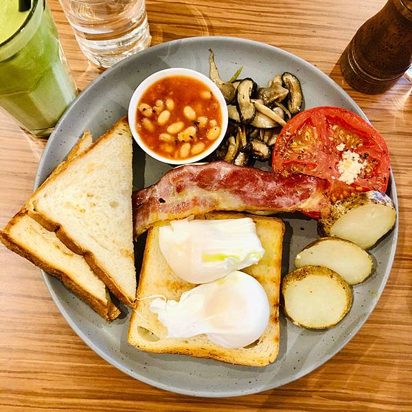 英式早餐裡面有自選蛋(水波蛋、煎蛋、炒蛋)、煙肉(培根)、香腸(豬肉香腸)、馬鈴薯、炒蘑菇、焗豆、烤蕃茄和烤麵包。