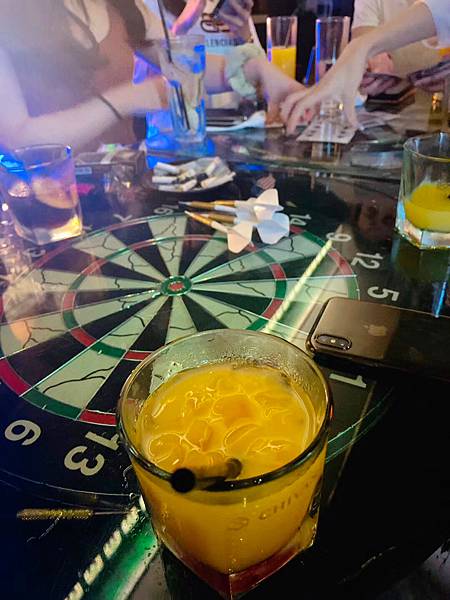 店內可以喝酒、射飛鏢、還有唱歌,店面是兩層樓,廁所在樓上。